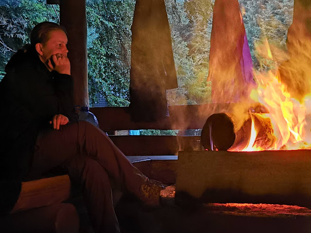 Na miejscu jacyś obcokrajowcy na krzesełkach okupujący ognisko. Na nasz widok przenoszą się pod wiatę, pod którą chcemy rozbić namioty, ponieważ wciąż pada. Więc rozpalimy pod drugą, z paleniskiem, by w ogóle zjeść coś ciepłego. Na szczęście zanim dobrze zdążamy rozbić obozowisko, towarzystwo znika i mamy wszystko tylko dla siebie. Można usiąść, wysuszyć się, zjeść spóźnioną kolację, odpocząć po ponad czterogodzinnej trasie, w kręgu ognia…