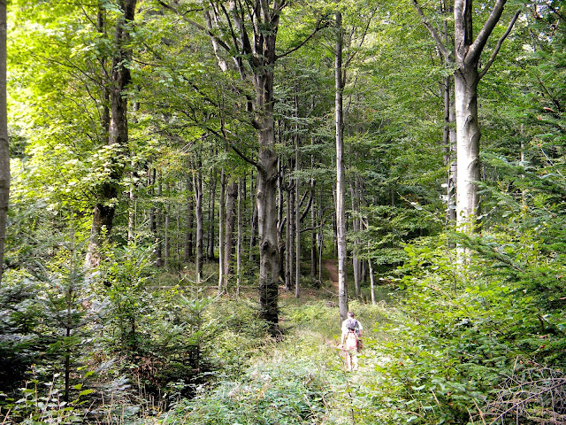 Dalej idzie się przyjemnie. W górę i w górę, ładnym, nieco skarlałym bukowym lasem, przez wykroty i skałki, ale już bez rzeźnickich podejść. Piękny ten las, taki bieszczadzki… Tylko ilość ludzi jak na mało zazwyczaj uczęszczany szlak nieco irytująca…